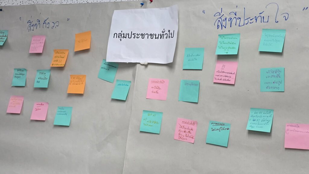 จากนั้นมีการบรรยายเพื่อให้ความรู้เกี่ยวกับการใช้ประโยชน์จาก AI ในมิติต่าง ๆ และนำเสนอให้เห็นถึงแง่มุมด้านจริยธรรม ความรับผิดชอบ และปัญหาจากการใช้ AI โดยนางสาวอลิษา ดาโอ๊ะ ผู้ผลิตสื่อสร้างสรรค์และนักวิจัยมหาวิทยาลัยสงขลานครินทร์ วิทยาเขตปัตตานี พร้อมทั้งฝึกปฏิบัติการใช้ AI และระดมความคิดเห็นจากผู้เข้าร่วมการเสวนาในหัวข้อสิ่งที่ประทับใจและความกังวลจากการใช้ AI มีตัวอย่างความคิดเห็น ดังต่อไปนี้